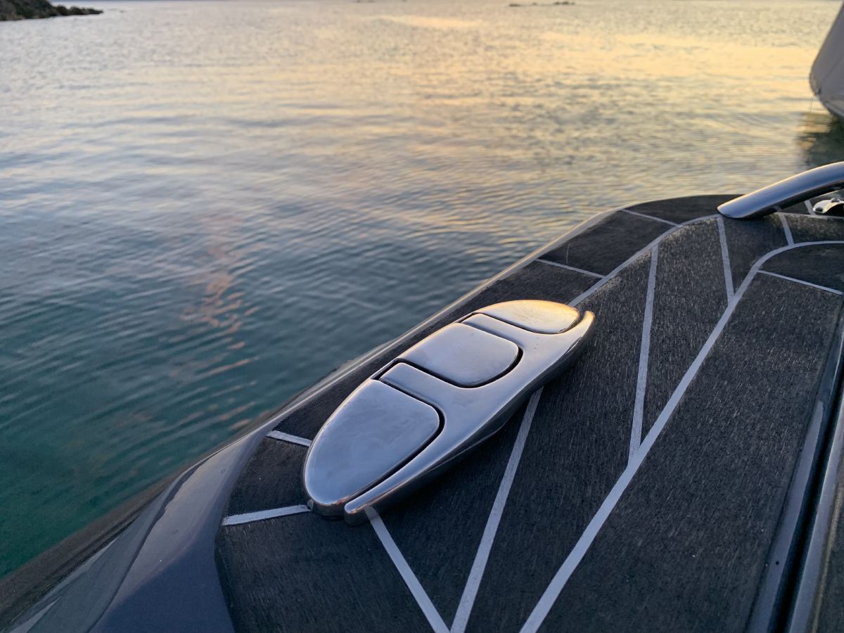 - Interior: Die Kabine bzw. der Innenraum, wird individuell nach Kundenwunsch gestaltet. In der Cabin Variante zu sehen, die offene Lounge Version mit integriertem WC und der Steuerbord Lounge Divan. Das Doppelbett hat einen wesentlichen Vorteil in dieser Klasse. Man kann in beiden Richtungen liegen, da die Matratze in der Waage ist. Das heißt einer bequemen Nacht zu zweit steht nichts im Wege. Eine indirekte LED ambient Beleuchtung mit Fernbedienung gehört zum Standard. Ausschließlich High End Polsterstoffe aus dem Yacht Bau haben wir für die Wandpanel und Sitzmöbel Polsterung ausgewählt. Die achterliche Sitzgruppe lässt sich in der Mitte komplett aufklappen, wodurch sich ein klassenüblich großer Stauraum erreichen lässt.