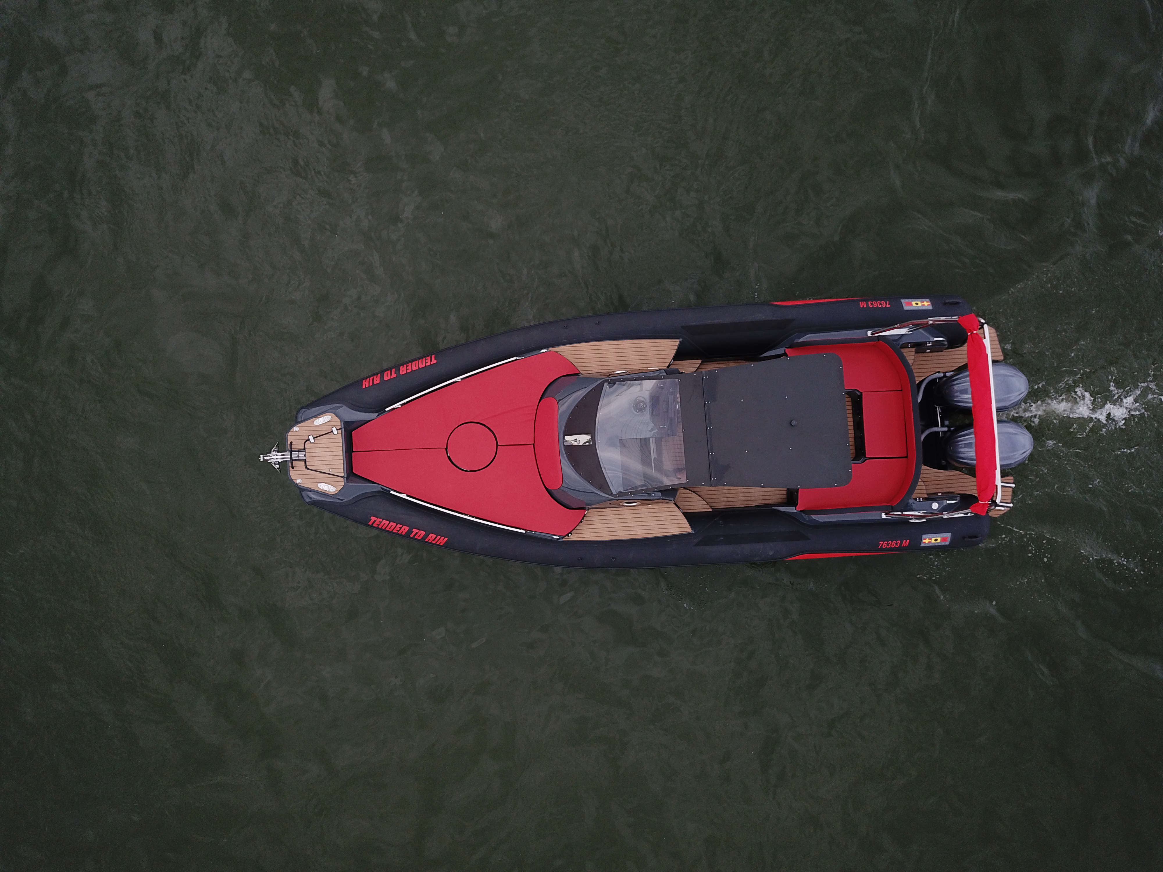 - Exterieur: Wir haben äußersten Wert auf die Funktionalität gelegt und trotzdem den Spagat geschafft das Design in seiner kompromisslosen Form nicht verändern zu müssen. Somit stehen Design und Funktionalität in Harmonie. Breite Durchgänge neben der Steuerkonsole gewährleisten ein Maximum an Trittsicherheit auch bei rauer See. Doppelte Heavy Duty Fenderleisten schützen den handgefertigten Schlauchkörper.