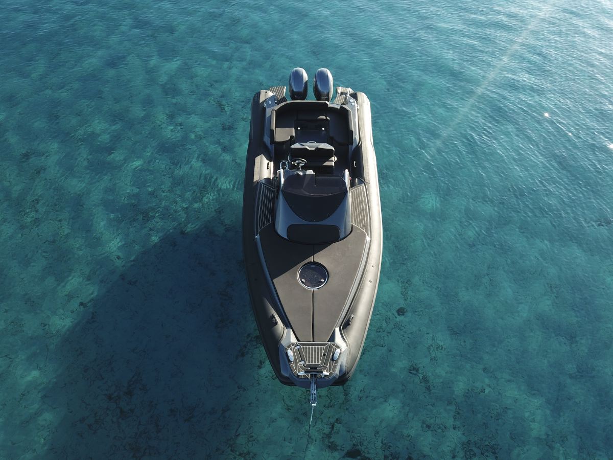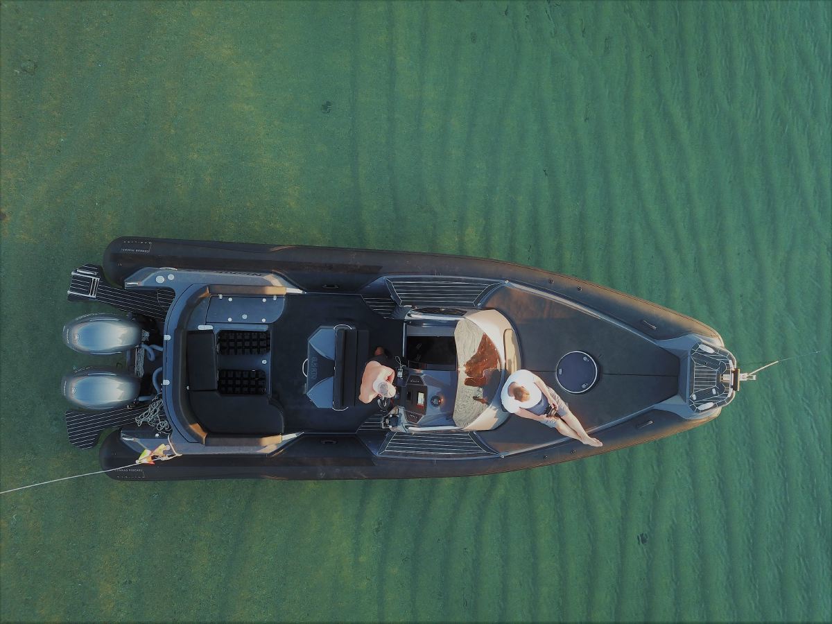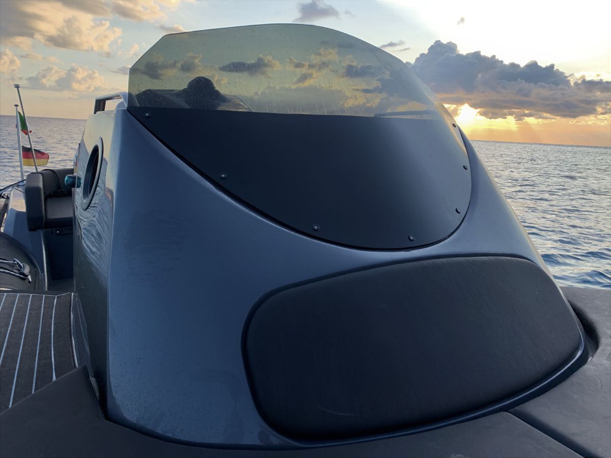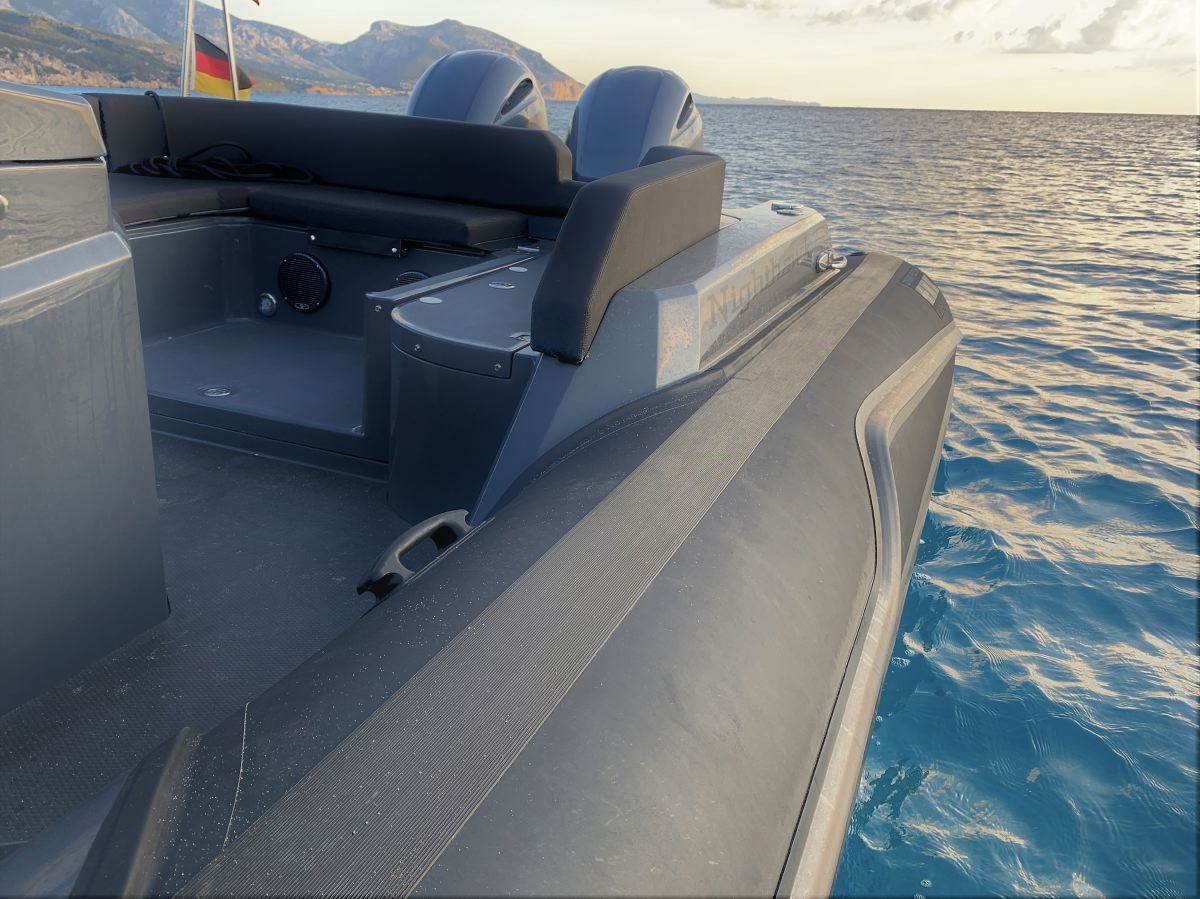 - Exterieur: Wir haben äußersten Wert auf die Funktionalität gelegt und trotzdem den Spagat geschafft das Design in seiner kompromisslosen Form nicht verändern zu müssen. Somit stehen Design und Funktionalität in Harmonie. Breite Durchgänge neben der Steuerkonsole gewährleisten ein Maximum an Trittsicherheit auch bei rauer See. Doppelte Heavy Duty Fenderleisten schützen den handgefertigten Schlauchkörper.
