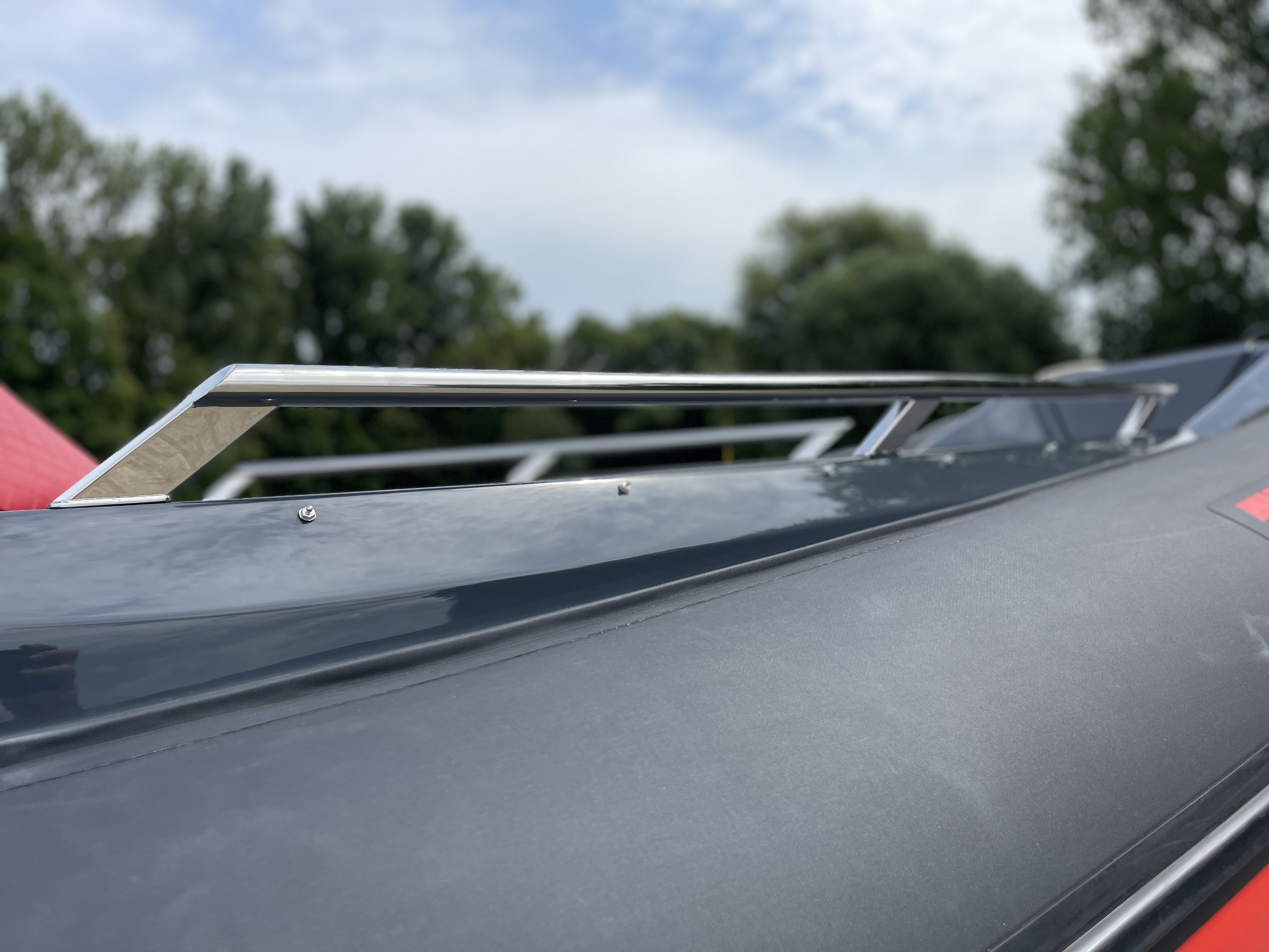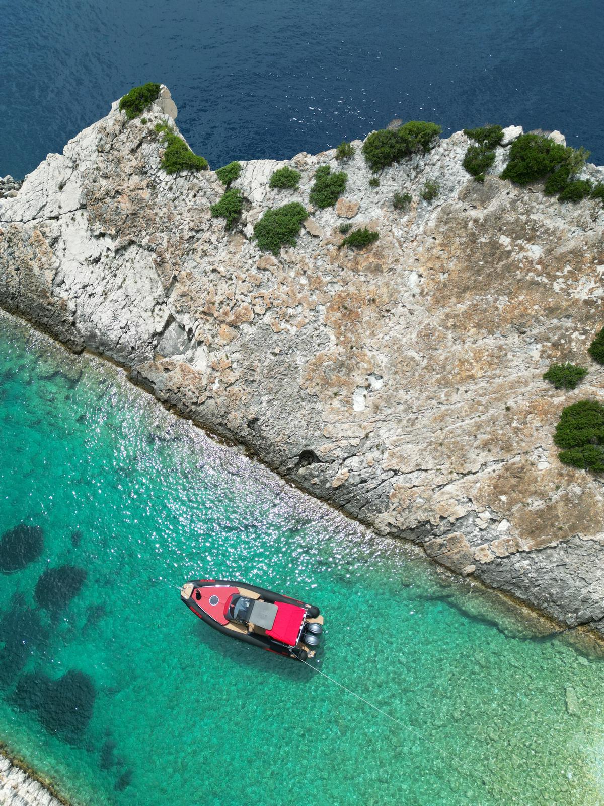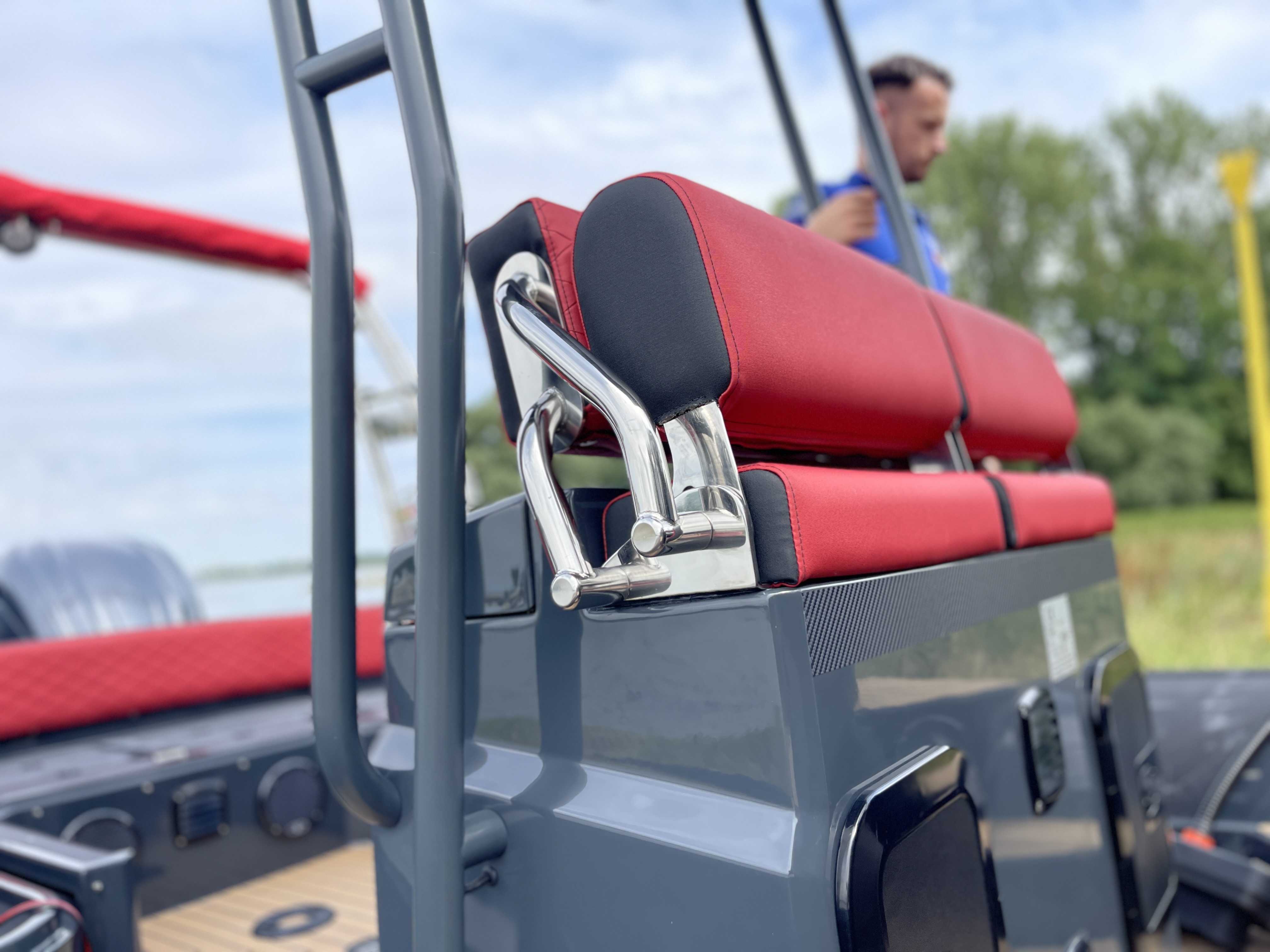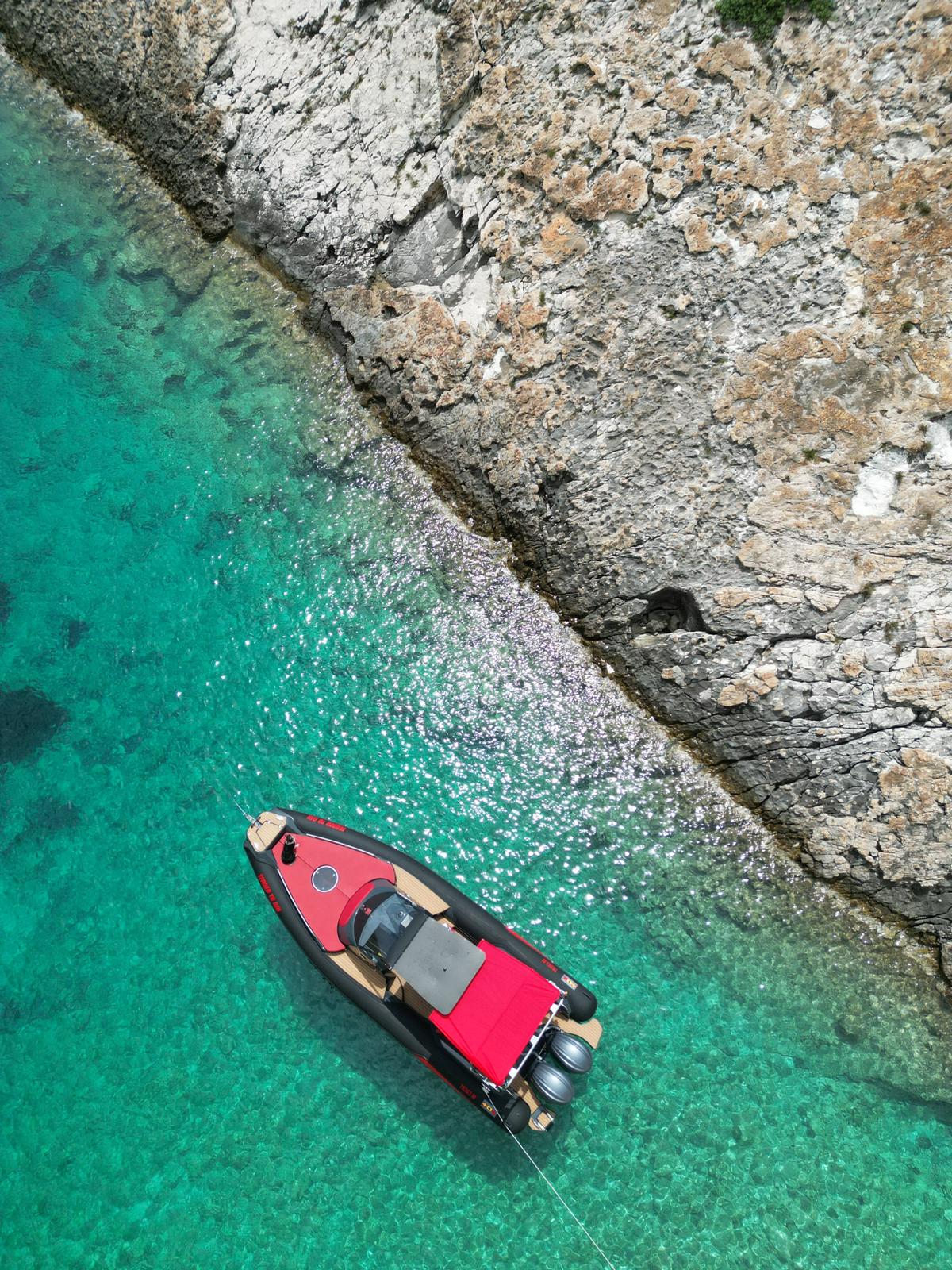- Exterieur: Wir haben äußersten Wert auf die Funktionalität gelegt und trotzdem den Spagat geschafft das Design in seiner kompromisslosen Form nicht verändern zu müssen. Somit stehen Design und Funktionalität in Harmonie. Breite Durchgänge neben der Steuerkonsole gewährleisten ein Maximum an Trittsicherheit auch bei rauer See. Doppelte Heavy Duty Fenderleisten schützen den handgefertigten Schlauchkörper.