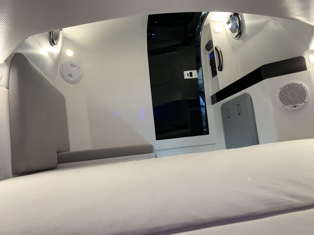 - Interior: Die Kabine bzw. der Innenraum, wird individuell nach Kundenwunsch gestaltet. In der Cabin Variante zu sehen, die offene Lounge Version mit integriertem WC und der Steuerbord Lounge Divan. Das Doppelbett hat einen wesentlichen Vorteil in dieser Klasse. Man kann in beiden Richtungen liegen, da die Matratze in der Waage ist. Das heißt einer bequemen Nacht zu zweit steht nichts im Wege. Eine indirekte LED ambient Beleuchtung mit Fernbedienung gehört zum Standard. Ausschließlich High End Polsterstoffe aus dem Yacht Bau haben wir für die Wandpanel und Sitzmöbel Polsterung ausgewählt. Die achterliche Sitzgruppe lässt sich in der Mitte komplett aufklappen, wodurch sich ein klassenüblich großer Stauraum erreichen lässt.